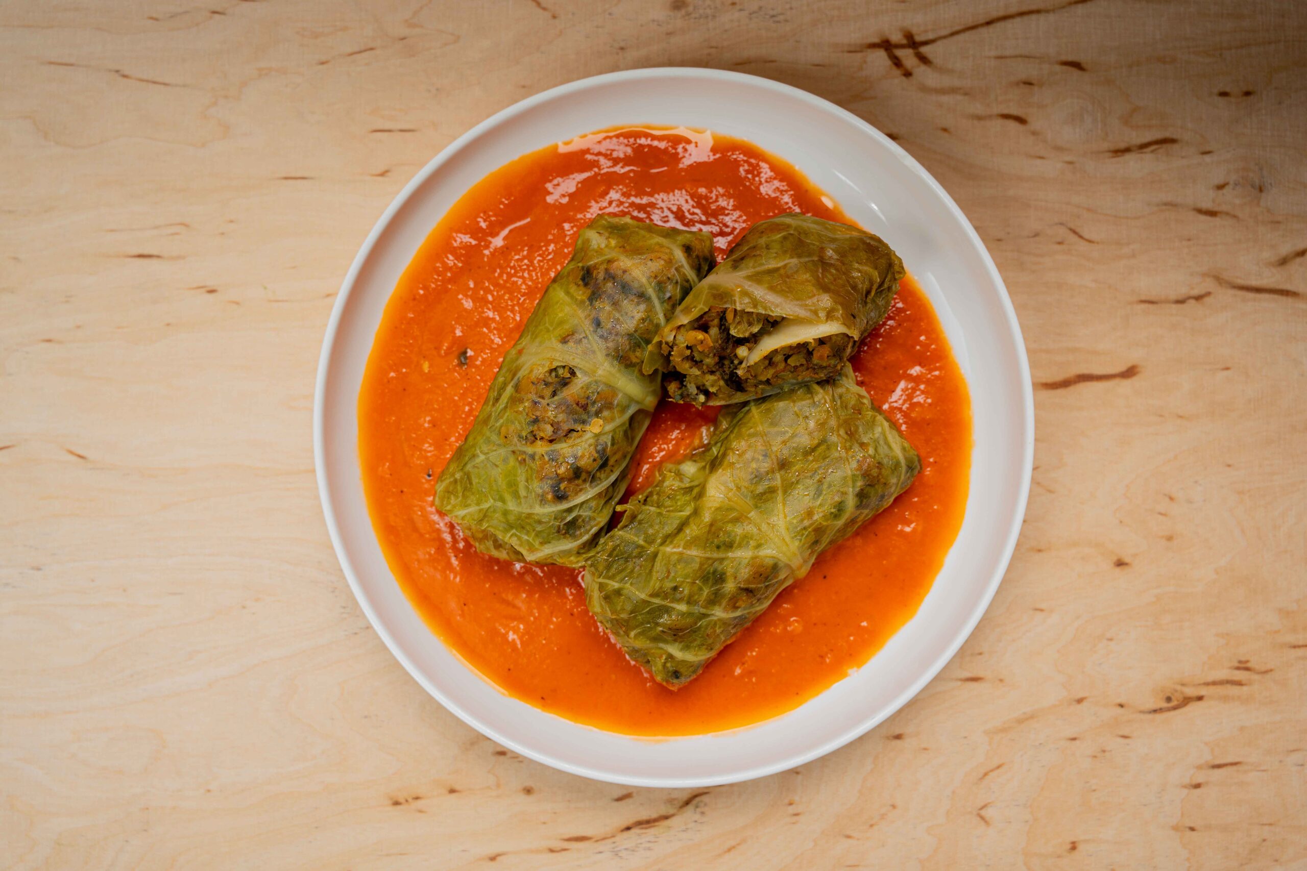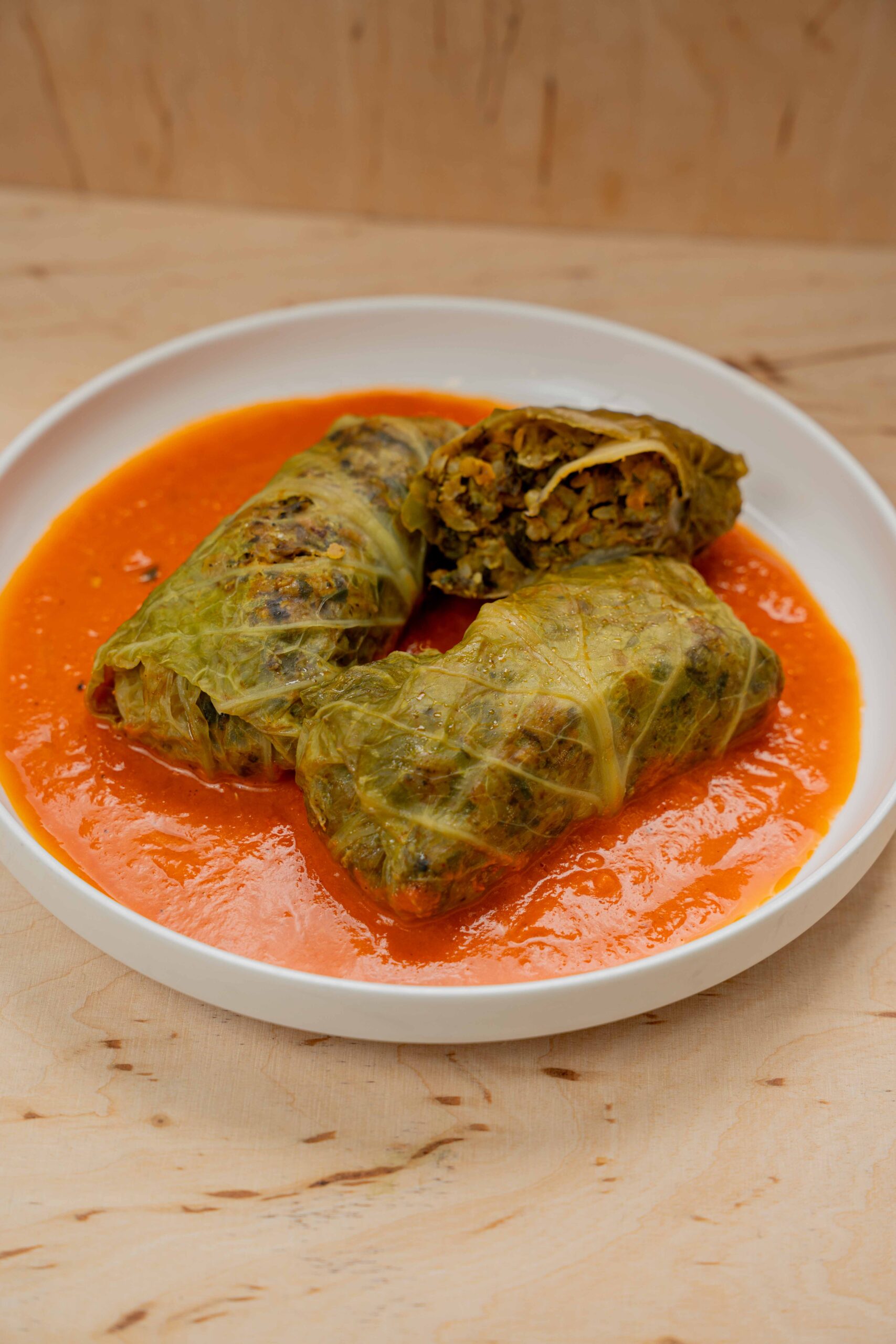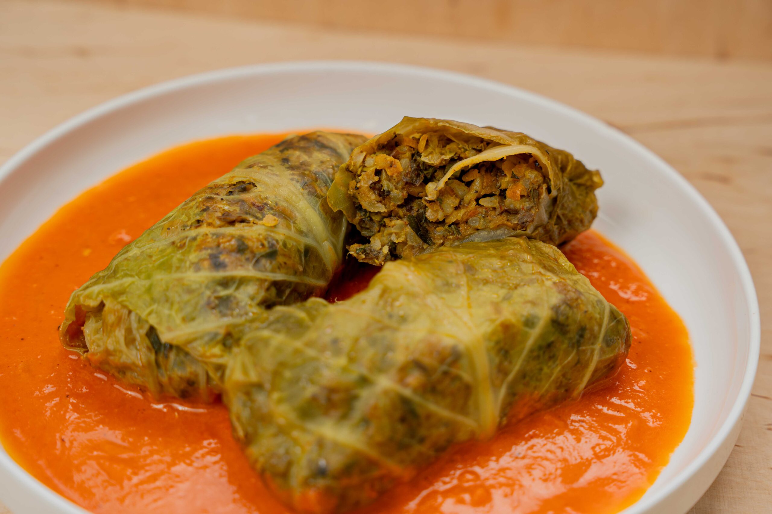 Delikatne liście kapusty wypełnione farszem z kaszy bulgur, duszonych warzyw i aromatycznych pieczarek.