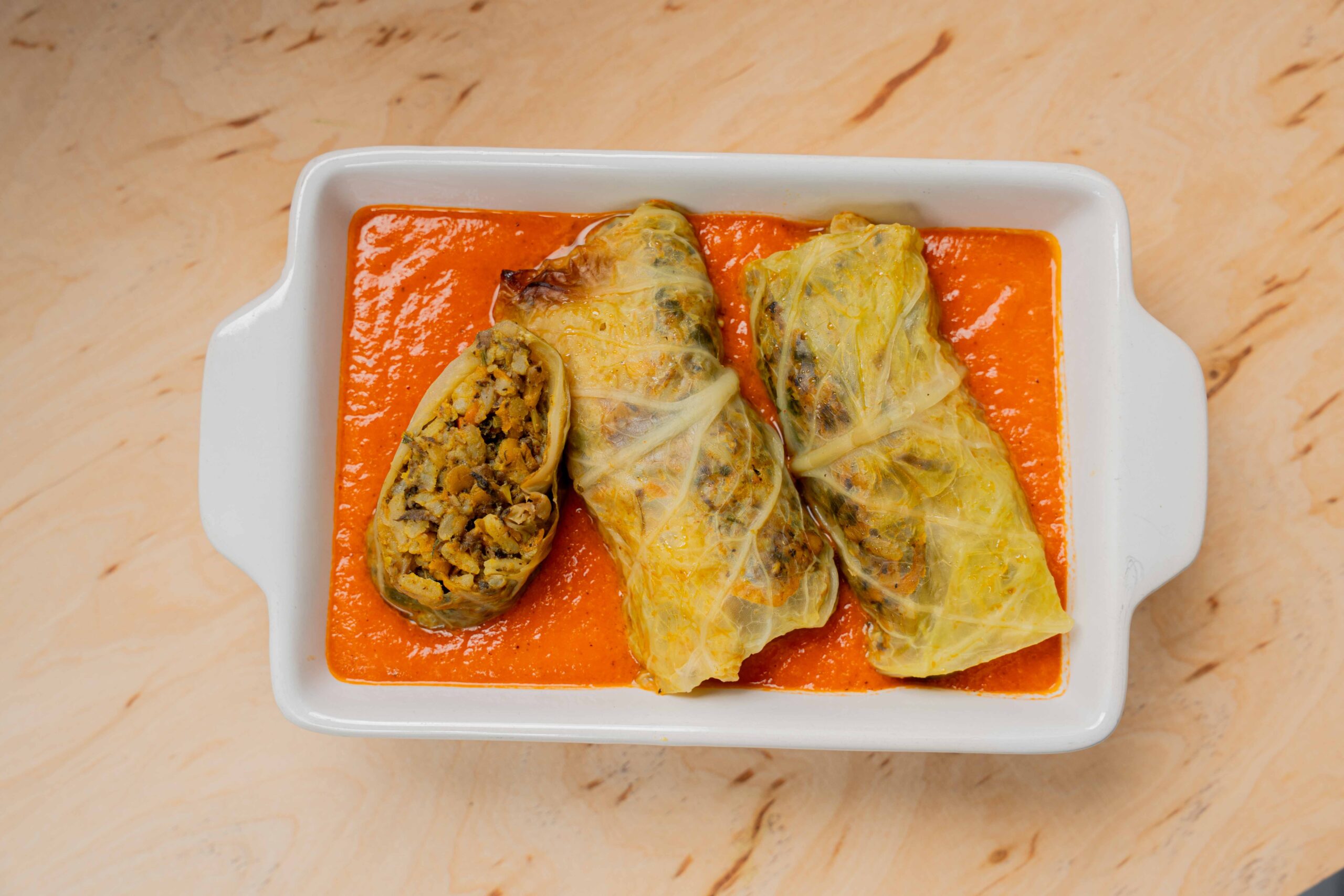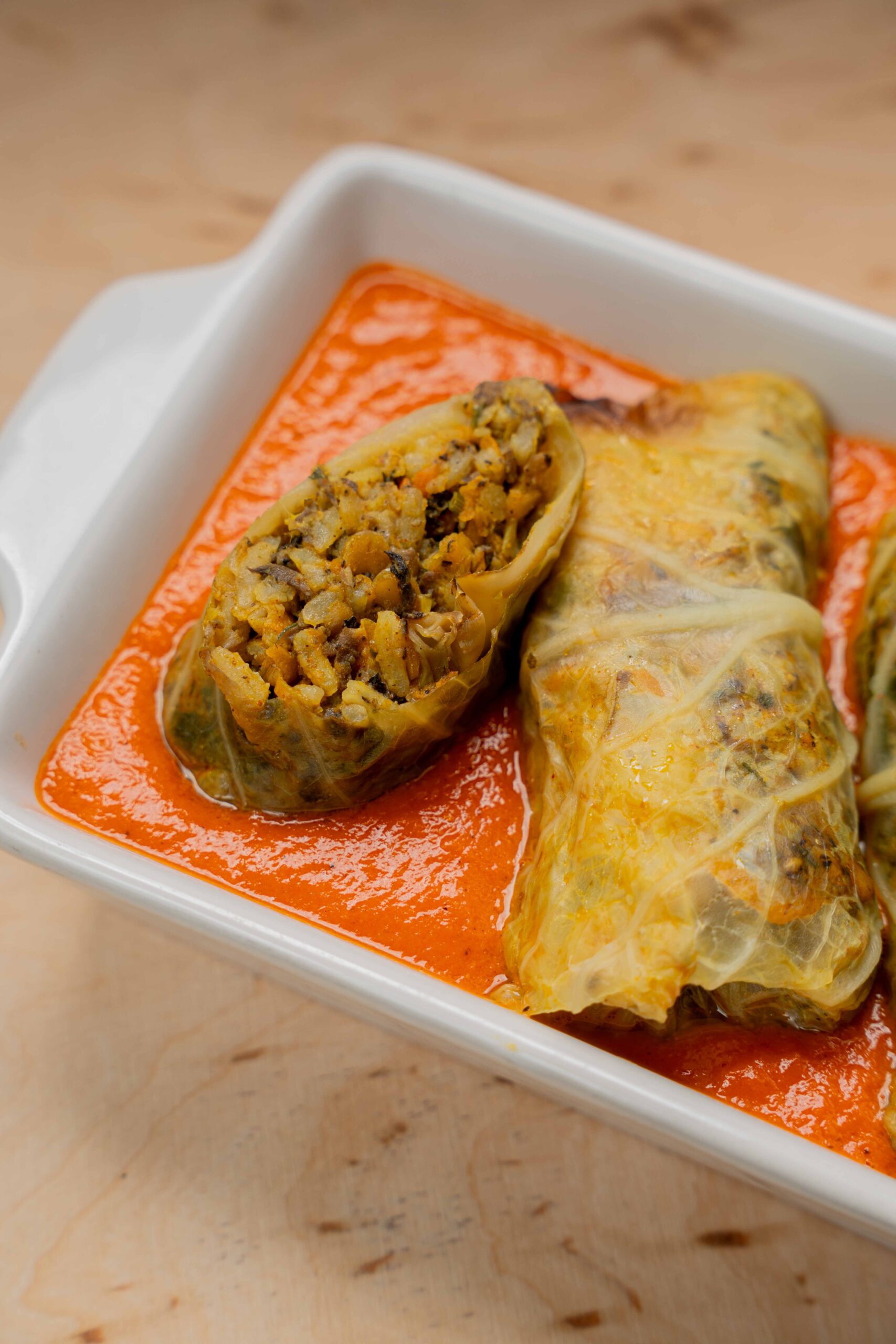 Tradycyjne gołąbki w lekkiej, roślinnej wersji. Delikatne liście kapusty włoskiej wypełnione są farszem z ryżu, czerwonej soczewicy, pieczarek i warzyw, doprawionym aromatycznymi ziołami.